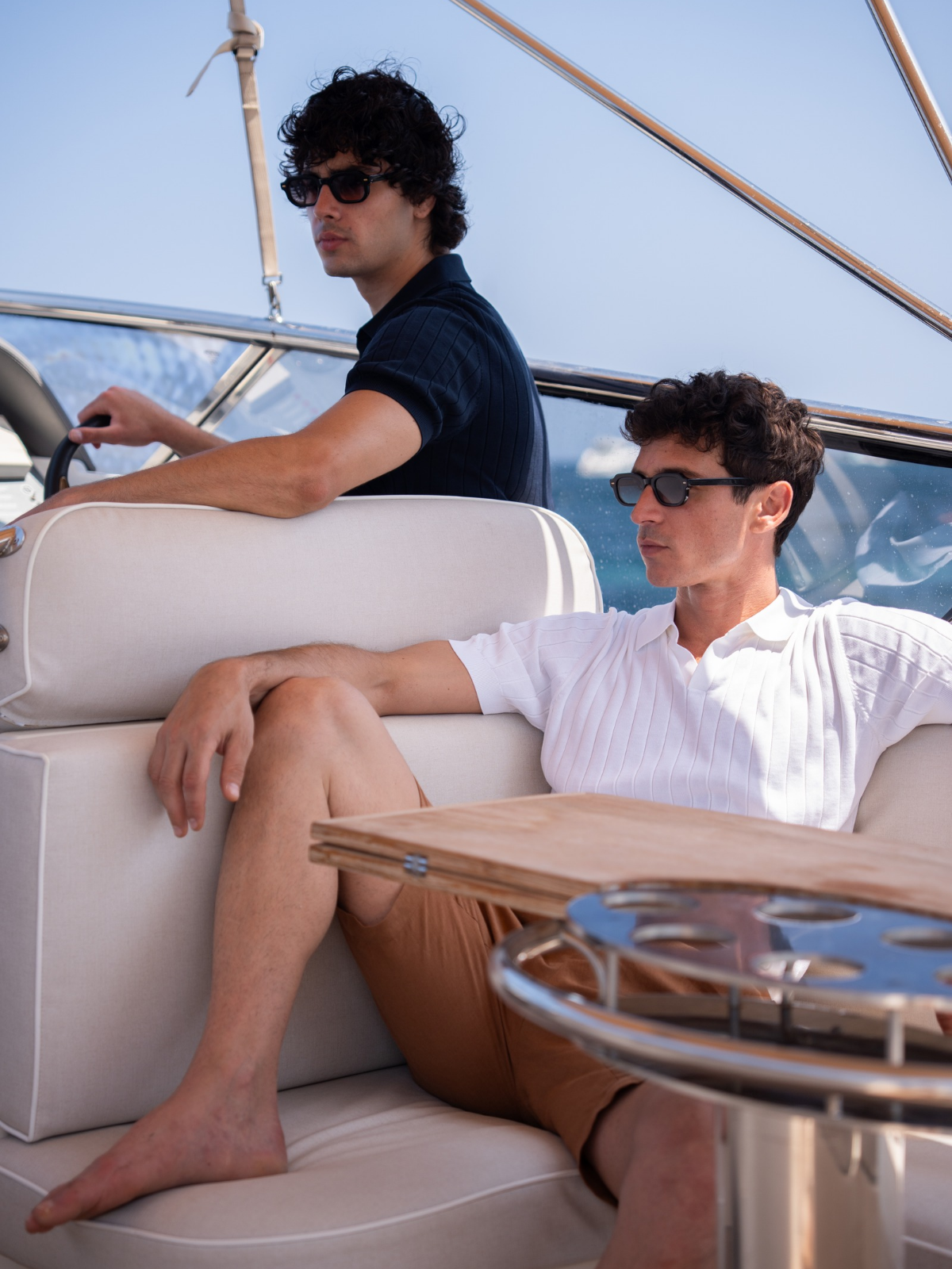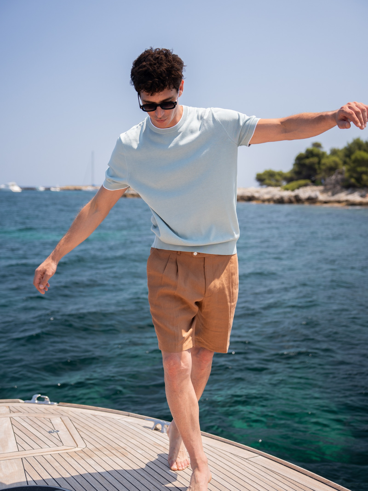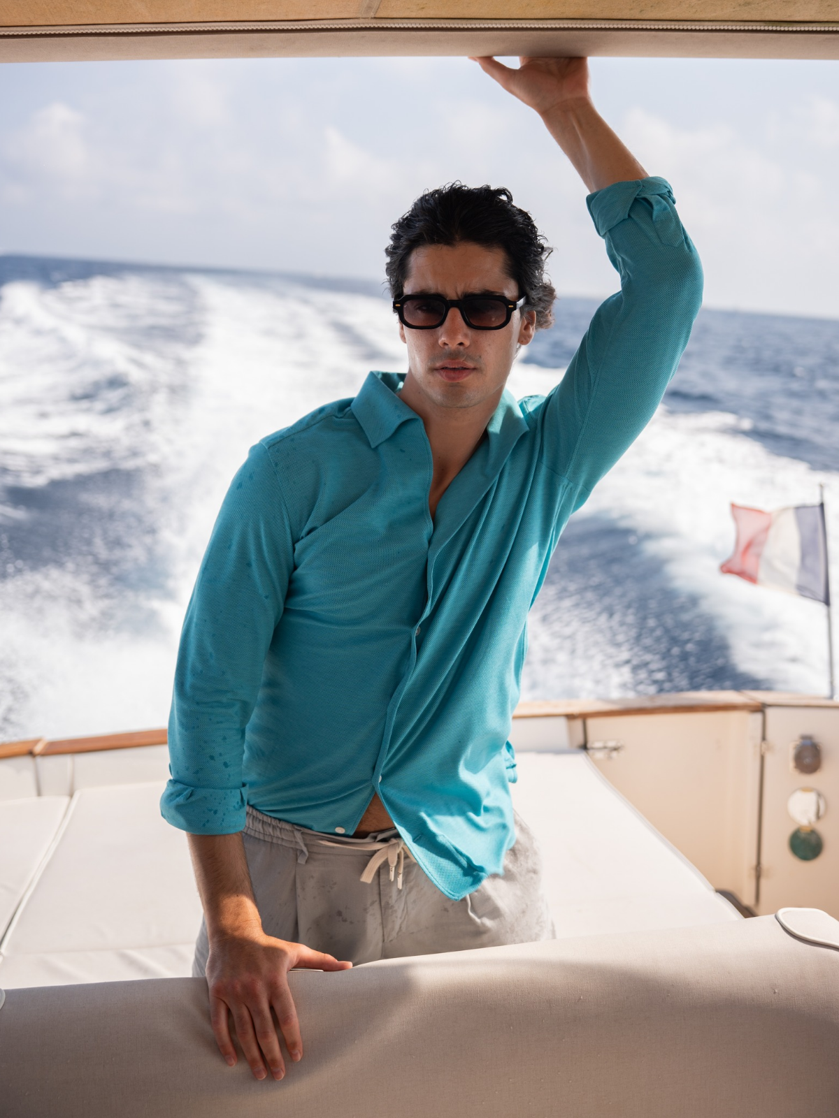 Where warm light runs fast across the water. Bold boat escapes meet salt-kissed pastels, our cotton-and-silk drop in motion, handmade in Naples shirts, and new sunwear built for speed.